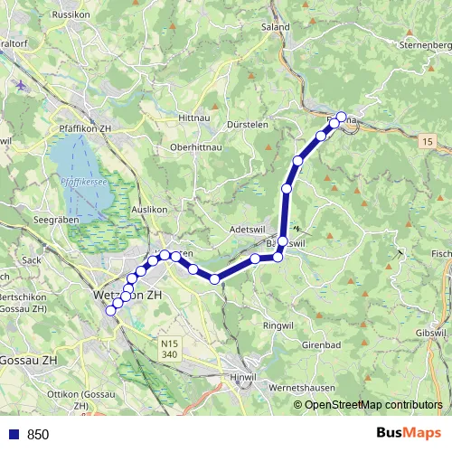 The first stop of the 850 bus route is Bauma, Bahnhof and the last stop is Wetzikon ZH, Bahnhof. 850 is operational during everyday.