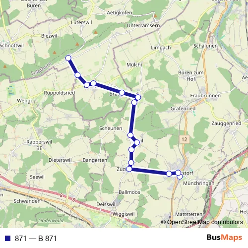 The first stop of the 871 bus route is Jegenstorf, Bahnhof and the last stop is Balm b. Messen, Wendeplatz. 871 (B 871) is operational during on weekdays.