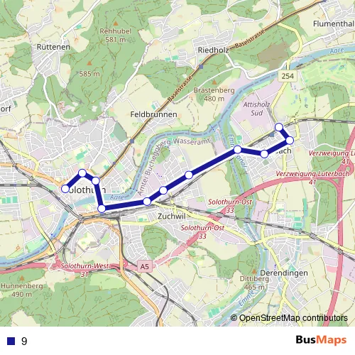 The first stop of the 9 bus route is Luterbach, Bahnhof Nordseite and the last stop is Solothurn, Amthausplatz. 9 is operational during everyday.