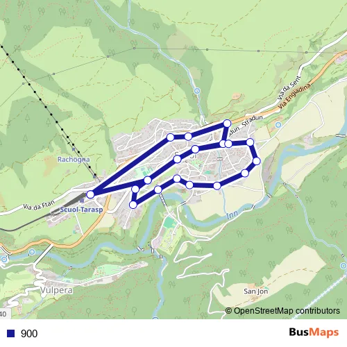 The first stop of the 900 bus route is Scuol-Tarasp, staziun and the last stop is Scuol-Tarasp, staziun. 900 is operational during everyday.