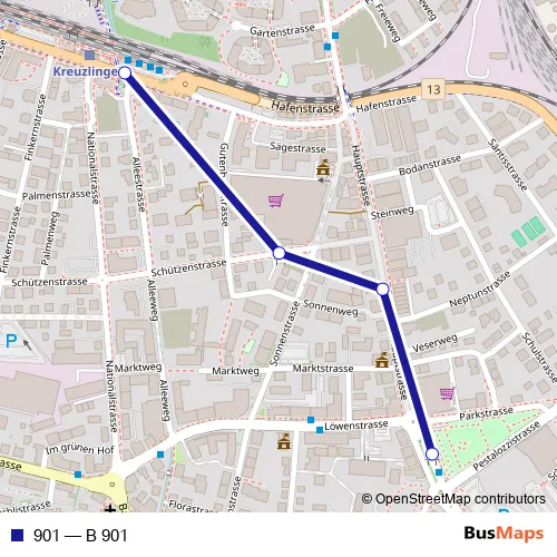 The first stop of the 901 bus route is Kreuzlingen, Bärenplatz and the last stop is Kreuzlingen, Bahnhof. 901 (B 901) is operational during everyday.