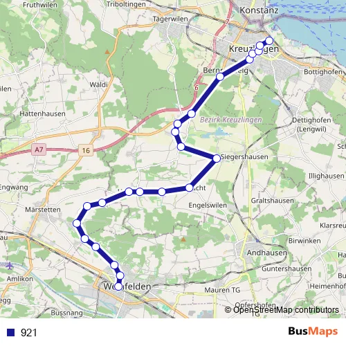 The first stop of the 921 bus route is Weinfelden, Bahnhof and the last stop is Kreuzlingen, Kantonsschule. 921 is operational during everyday.