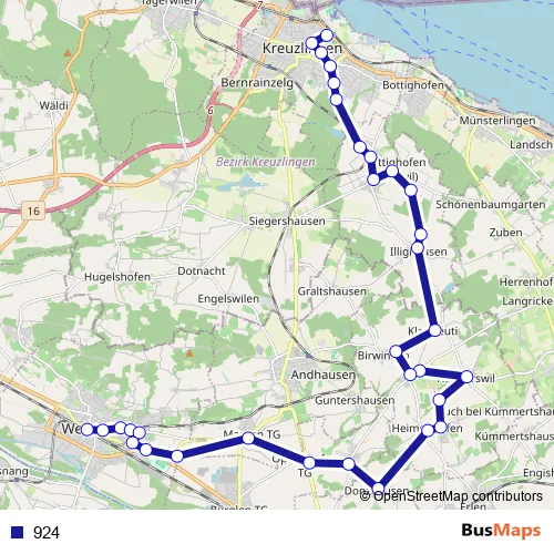 The first stop of the 924 bus route is Weinfelden, Bahnhof and the last stop is Kreuzlingen, Kantonsschule. 924 is operational during everyday.