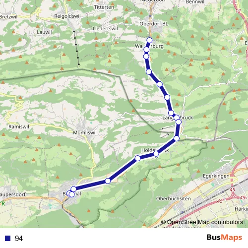 The first stop of the 94 bus route is Waldenburg, Station and the last stop is Balsthal, Bahnhof. 94 is operational during everyday.