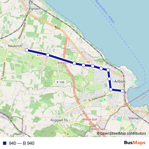 The first stop of the 940 bus route is Neukirch (Egnach), Ost and the last stop is Arbon, Bahnhof. 940 (B 940) is operational during on weekdays.