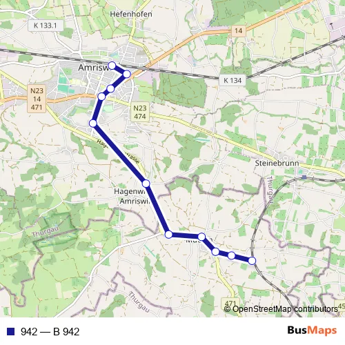 The first stop of the 942 bus route is Muolen, Bahnhof and the last stop is Amriswil, Bahnhof. 942 (B 942) is operational during everyday.