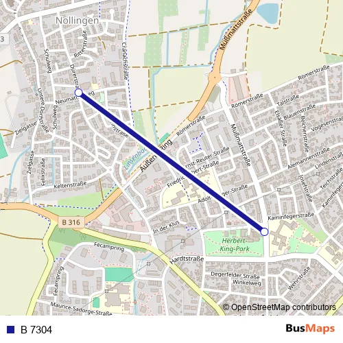 The first stop of the B 7304 bus route is Rheinfelden (D), Bürgerheim and the last stop is Nollingen, Hebelhalle. B 7304 is operational during everyday.