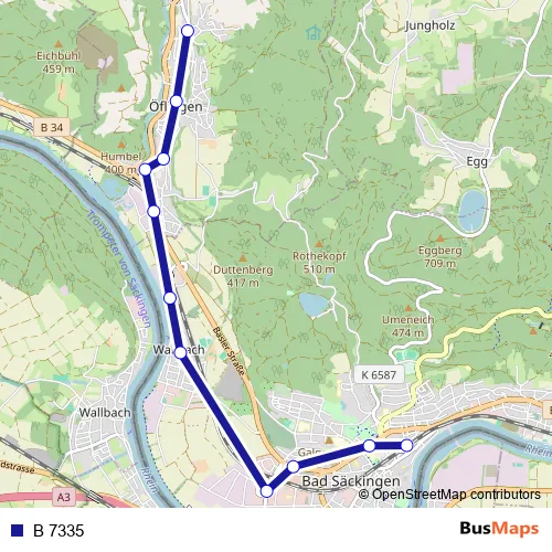 The first stop of the B 7335 bus route is Öflingen, Brühlstrasse and the last stop is Bad Säckingen, Bahnhof. B 7335 is operational during on weekdays.