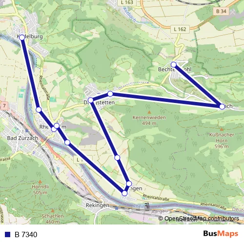 The first stop of the B 7340 bus route is Kadelburg, Grundschule and the last stop is Bechtersbohl. B 7340 is operational during on weekdays.