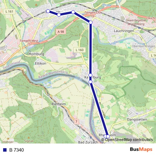 The first stop of the B 7340 bus route is Rheinheim, Färberweg and the last stop is Tiengen (Hochrhein), Bahnhof. B 7340 is operational during on weekdays.