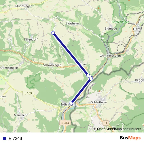 The first stop of the B 7346 bus route is Lembach b Wutach, Ortsmitte and the last stop is Stühlingen, Bahnhof. B 7346 is operational during on weekdays.
