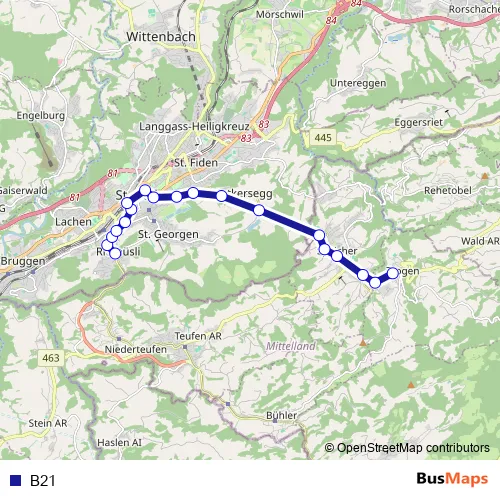 The first stop of the B21 bus route is St. Gallen, Riethüsli and the last stop is Trogen, Bahnhof. B21 is operational during on weekends.