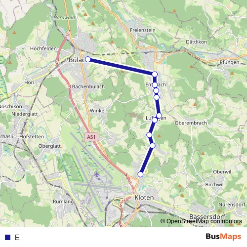 The first stop of the E bus route is Kloten, Freienberg and the last stop is Bülach, Kantonsschule. E is operational during on weekdays.