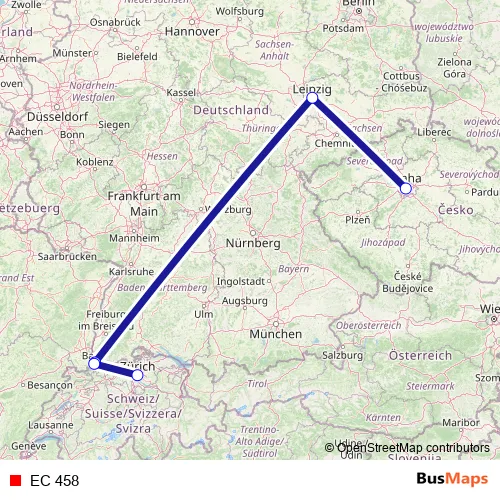 The first stop of the EC 458 rail route is Praha hl. n. and the last stop is Zürich Hb. EC 458 is operational during everyday.