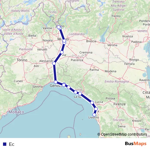 The first stop of the Ec rail route is Chiasso and the last stop is Livorno Centrale. Ec is operational during everyday.