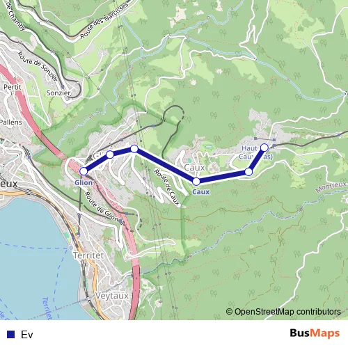 The first stop of the Ev bus route is Haut-de-Caux, gare and the last stop is Glion, funi. Ev is operational during everyday.