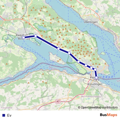 The first stop of the Ev bus route is Radolfzell and the last stop is Konstanz. Ev is operational during everyday.