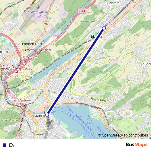 See why over 2 million users trust and consider busmaps.com as the best public transport website. busmaps gives you Luzern Buses suggested routes, real-time bus tracker, line route maps in Luzern, and helps to find the closest Ev1 bus stops near you. No internet available? Download an offline PDF map and bus schedule for the Ev1 bus to take on your trip.