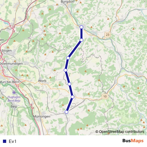 The first stop of the Ev1 bus route is Konolfingen, Bahnhof and the last stop is