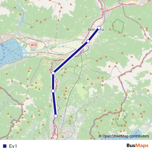 The first stop of the Ev1 bus route is Taverne-Torricella, Stazione and the last stop is Bellinzona, Stazione. Ev1 is operational during everyday.