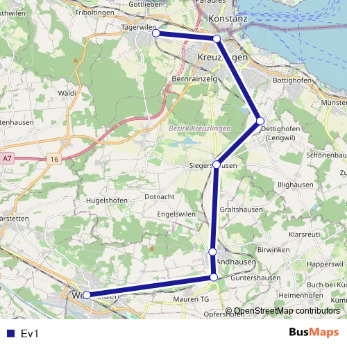 The first stop of the Ev1 bus route is Tägerwilen Dorf, Bahnhof and the last stop is Weinfelden, Bahnhof. Ev1 is operational during everyday.