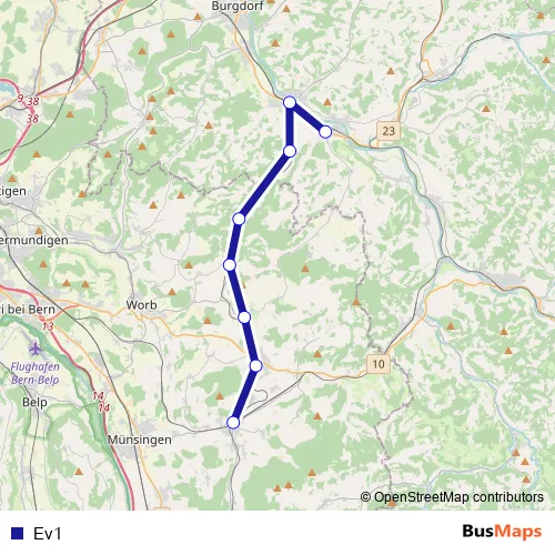 The first stop of the Ev1 bus route is Konolfingen, Bahnhof and the last stop is