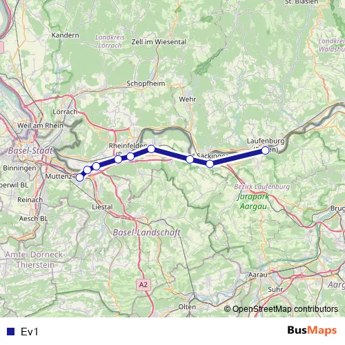 The first stop of the Ev1 bus route is Laufenburg, Bahnhof and the last stop is Pratteln, Bahnhof Nord. Ev1 is operational during everyday.