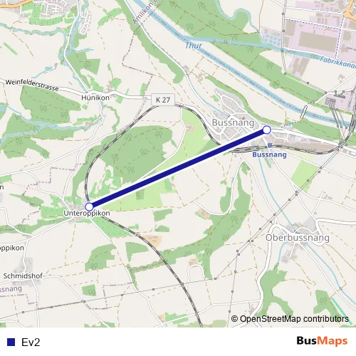 The first stop of the Ev2 bus route is Oppikon, Bahnhof and the last stop is Bussnang, Gemeindehaus. Ev2 is operational during everyday.