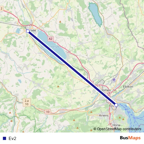 The first stop of the Ev2 bus route is Sursee, Schnydermatt and the last stop is Luzern, Bahnhof. Ev2 is operational during everyday.