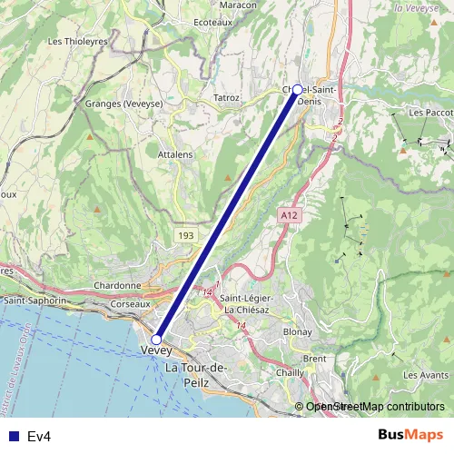The first stop of the Ev4 bus route is Châtel-St-Denis, gare and the last stop is Vevey, gare. Ev4 is operational during on weekdays.