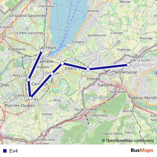 See why over 2 million users trust and consider busmaps.com as the best public transport website. busmaps gives you Geneve Buses suggested routes, real-time bus tracker, line route maps in Geneve, and helps to find the closest Ev4 bus stops near you. No internet available? Download an offline PDF map and bus schedule for the Ev4 bus to take on your trip.