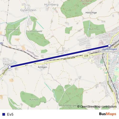The first stop of the Ev5 bus route is Tägertschi, Dorf and the last stop is Konolfingen, Bahnhof. Ev5 is operational during everyday.