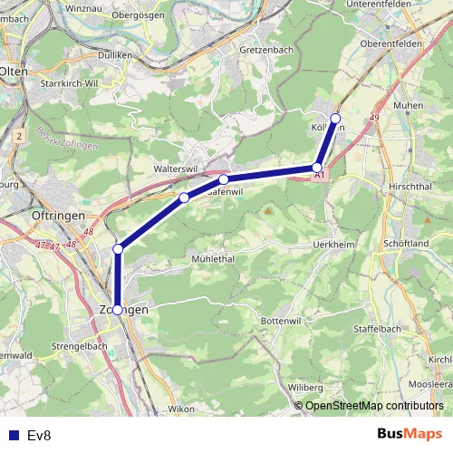 The first stop of the Ev8 bus route is Kölliken, Bahnhof and the last stop is Zofingen, Bahnhofplatz. Ev8 is operational during everyday.