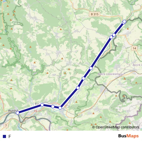The first stop of the F bus route is Waldshut Busbahnhof, Waldshut-Tiengen and the last stop is Weizen Bahnhof, Stühlingen. F is operational during everyday.