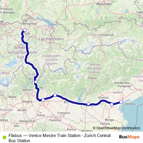 The first stop of the Flixbus bus route is Venice Mestre Train Station Bus Stop and the last stop is Zurich Ausstellungsstrasse. Flixbus (Venice Mestre Train Station - Zurich Central Bus Station) is operational during everyday.