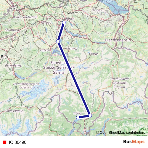 The first stop of the IC 30490 rail route is Zürich Hb and the last stop is Locarno. IC 30490 is operational during on weekends.