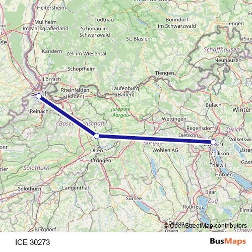 The first stop of the ICE 30273 rail route is Basel Sbb and the last stop is Zürich Hb. ICE 30273 is operational during everyday.