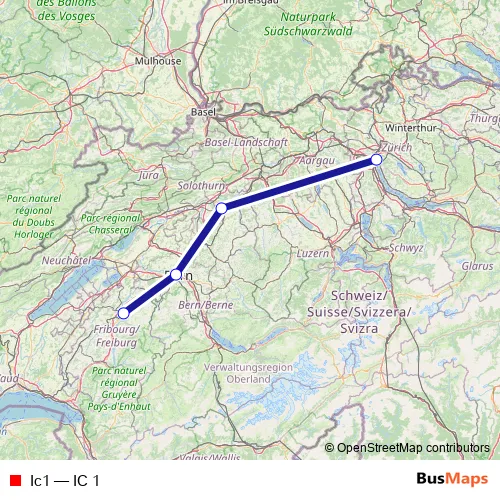 The first stop of the Ic1 rail route is Zürich Hb and the last stop is Fribourg/Freiburg. Ic1 (IC 1) is operational during on weekends.