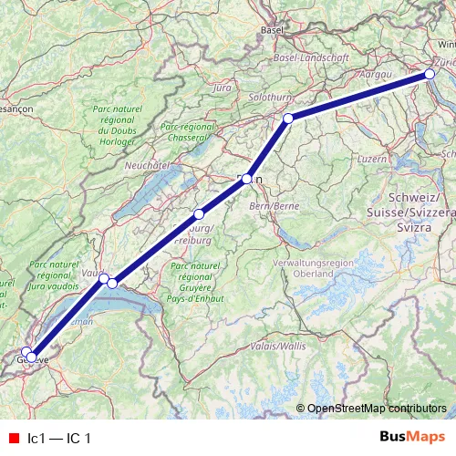 The first stop of the Ic1 rail route is Genève-Aéroport and the last stop is Zürich Hb. Ic1 (IC 1) is operational during everyday.