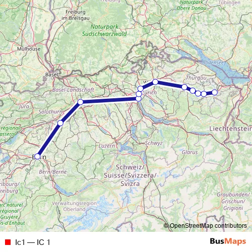 The first stop of the Ic1 rail route is Bern and the last stop is St. Gallen. Ic1 (IC 1) is operational during everyday.