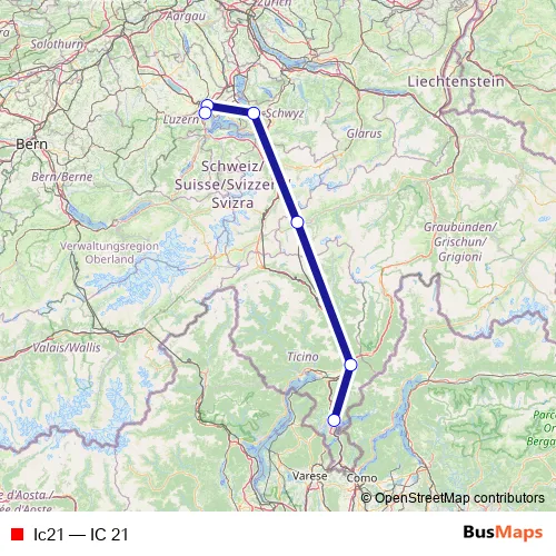 The first stop of the Ic21 rail route is Lugano and the last stop is Luzern. Ic21 (IC 21) is operational during everyday.