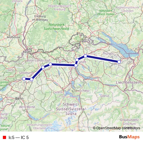 The first stop of the Ic5 rail route is Solothurn and the last stop is St. Gallen. Ic5 (IC 5) is operational during on weekends.