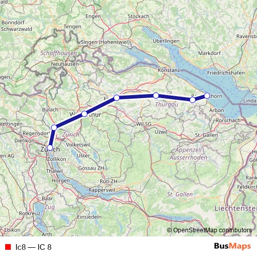 The first stop of the Ic8 rail route is Zürich Hb and the last stop is Romanshorn. Ic8 (IC 8) is operational during everyday.