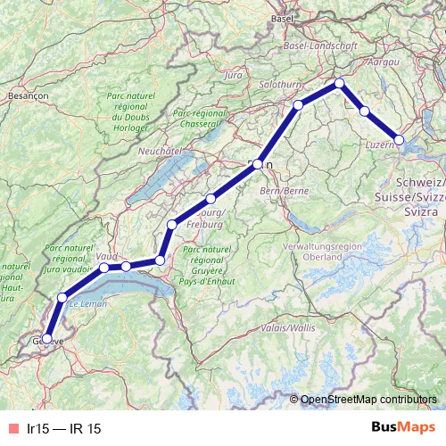The first stop of the Ir15 rail route is Luzern and the last stop is Genève. Ir15 (IR 15) is operational during everyday.