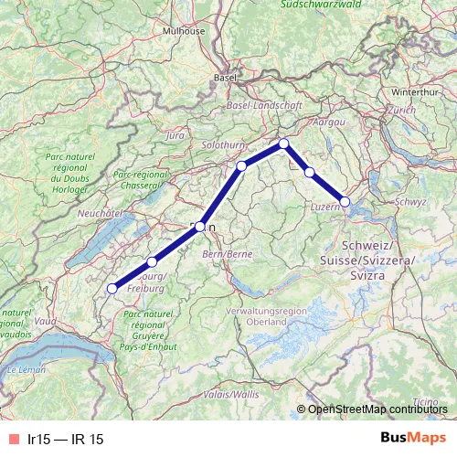 The first stop of the Ir15 rail route is Luzern and the last stop is Romont Fr. Ir15 (IR 15) is operational during on weekends.