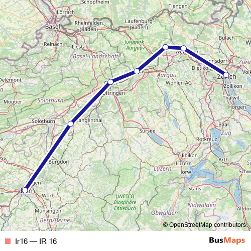 The first stop of the Ir16 rail route is Zürich Hb and the last stop is Bern. Ir16 (IR 16) is operational during everyday.