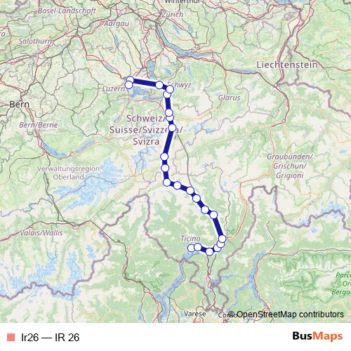 The first stop of the Ir26 rail route is Locarno and the last stop is Luzern. Ir26 (IR 26) is operational during everyday.