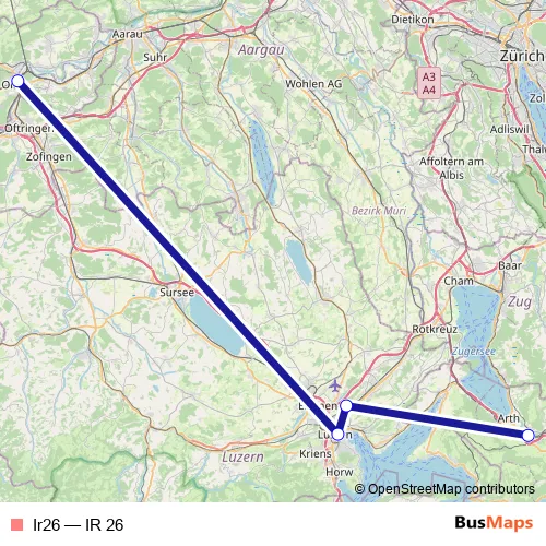 The first stop of the Ir26 rail route is Olten and the last stop is Arth-Goldau. Ir26 (IR 26) is operational during on weekends.