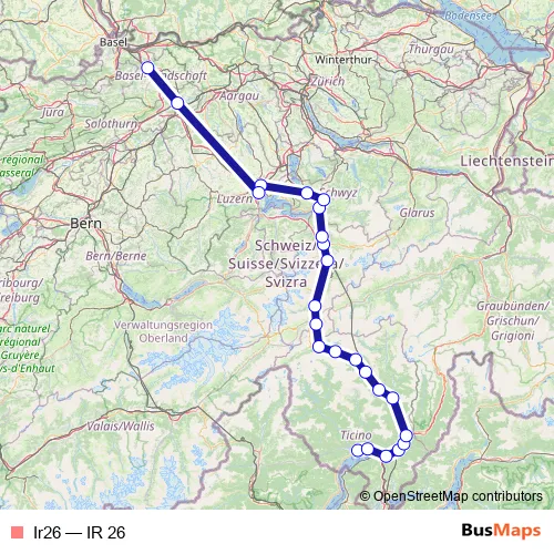 The first stop of the Ir26 rail route is Locarno and the last stop is Lausen. Ir26 (IR 26) is operational during on weekends.