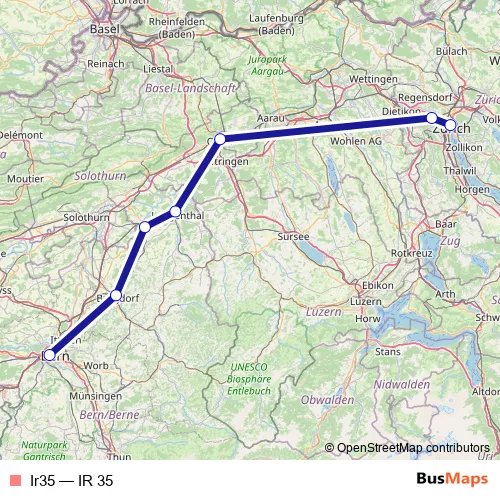 The first stop of the Ir35 rail route is Zürich Hb and the last stop is Bern. Ir35 (IR 35) is operational during everyday.